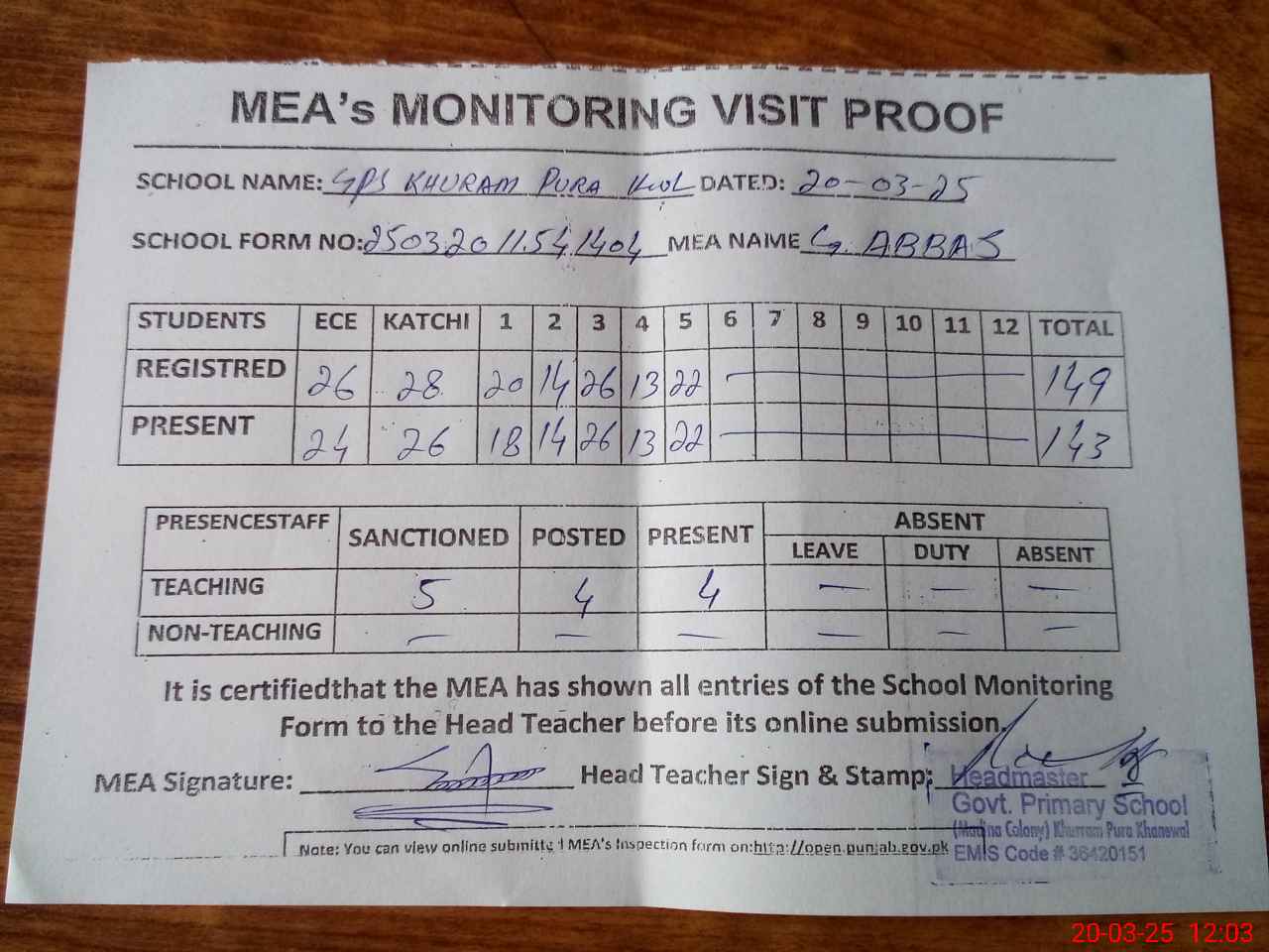 | EMIS Code: 36420151 | Name of School: GPS KHURRAM PURA, MADINA COLONY, KHANEWAL | |||