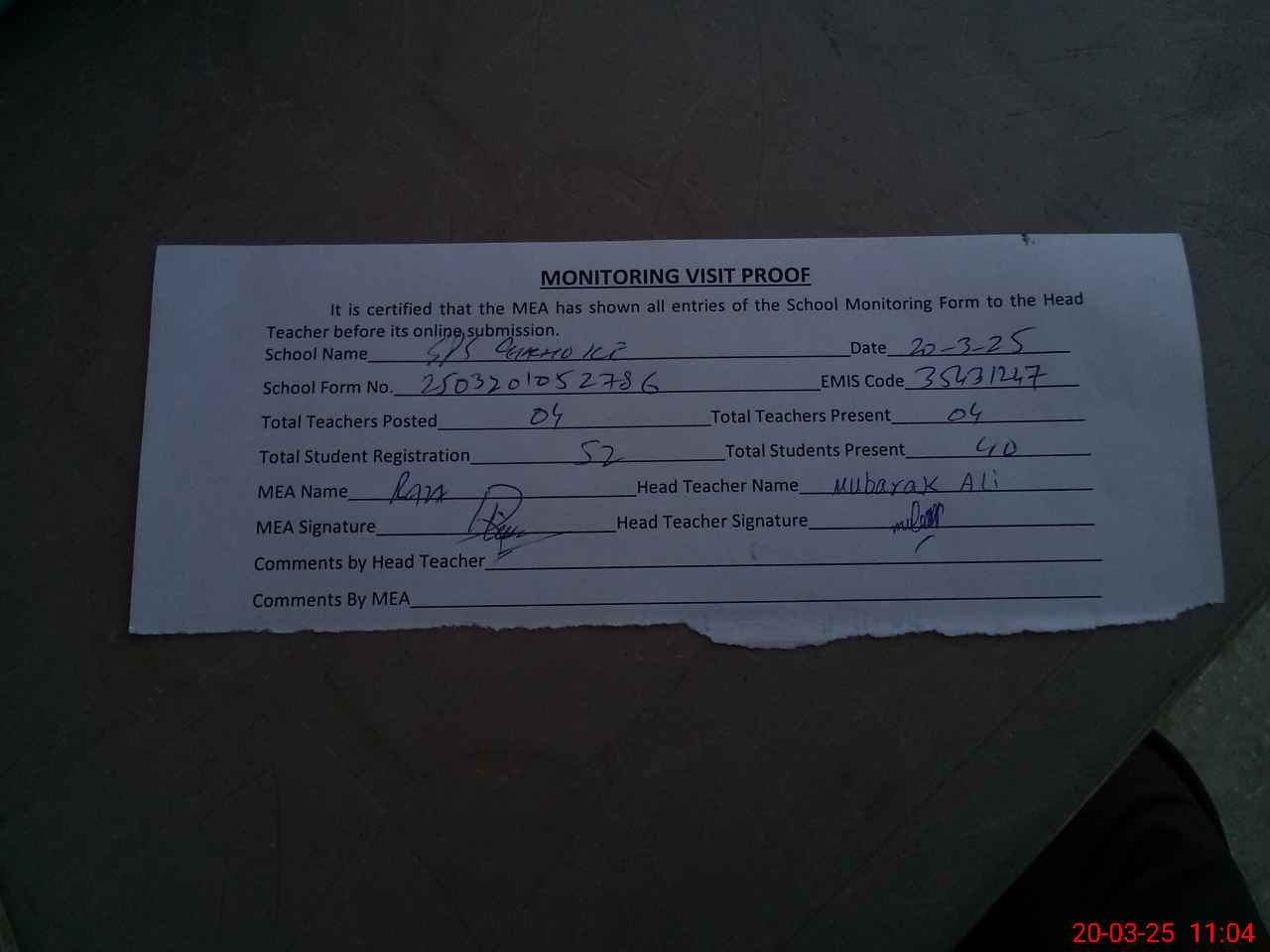 | Attendance Register | Head Teacher | MEA with School | Visit Proof |