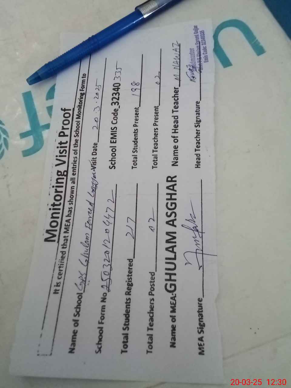 | Attendance Register | Head Teacher | MEA with School | Visit Proof |