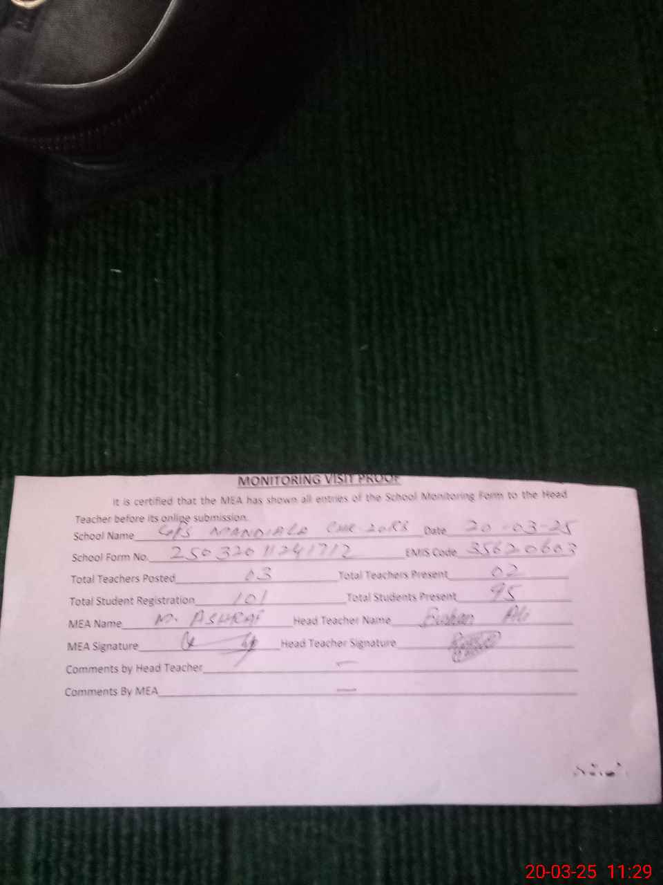 | Attendance Register | Head Teacher | MEA with School | Visit Proof |