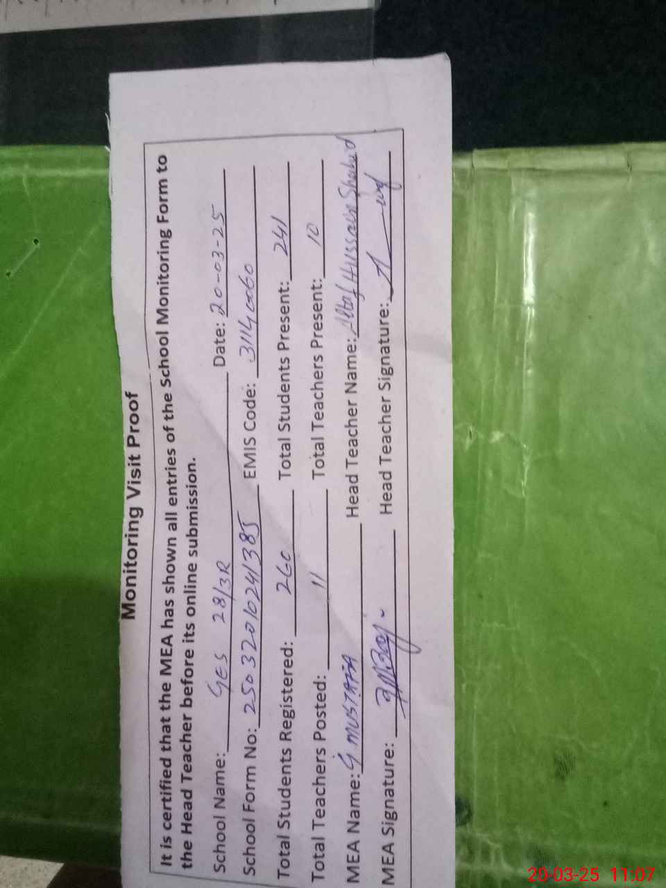 | Attendance Register | Head Teacher | MEA with School | Visit Proof |