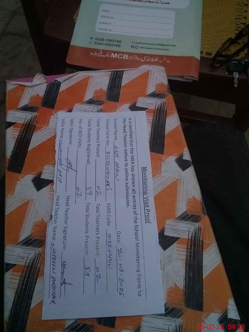 | Attendance Register | Head Teacher | MEA with School | Visit Proof |