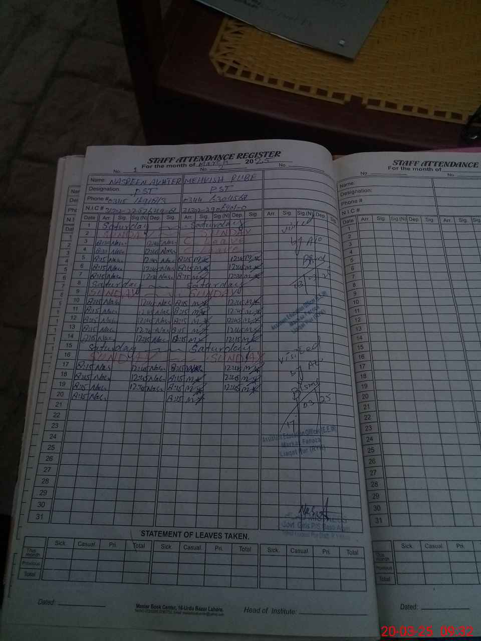 | CNIC | Full Name | Designation | R/C | Absence During Last Calender Month |