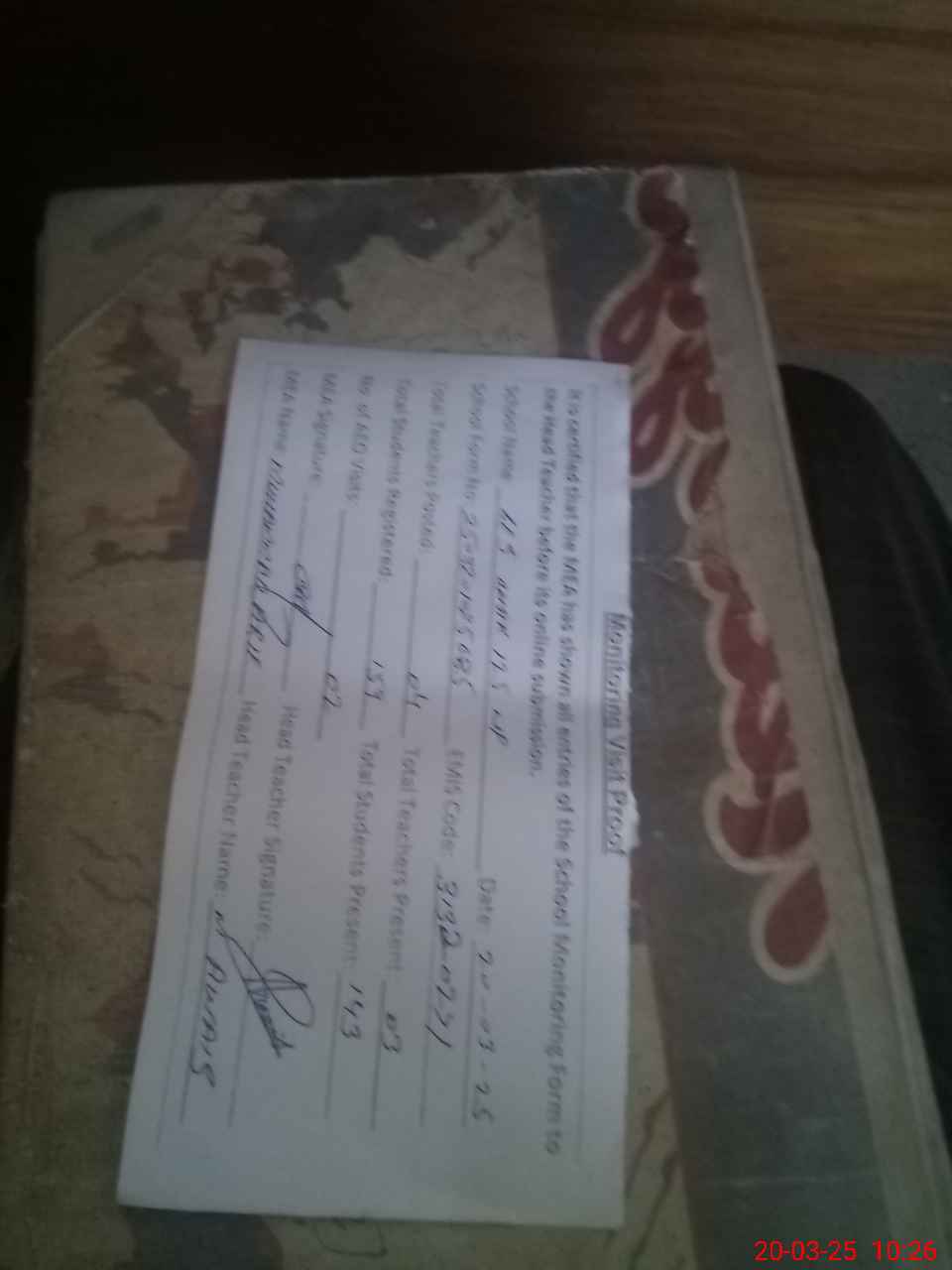 | Attendance Register | Head Teacher | MEA with School | Visit Proof |