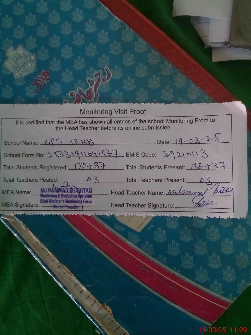 | Attendance Register | Head Teacher | MEA with School | Visit Proof |
