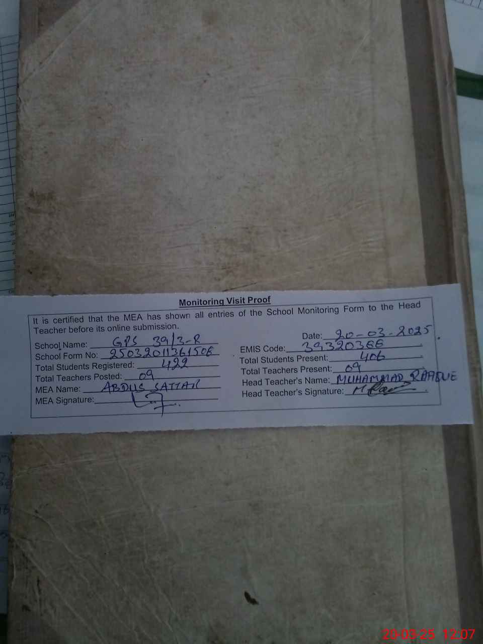 | EMIS Code: 39320388 | Name of School: GES CHAK NO. 39/3-R | |||