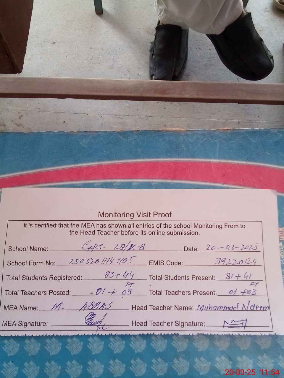 | EMIS Code: 39220124 | Name of School: GPS CHAK NO. 28 KB | |||