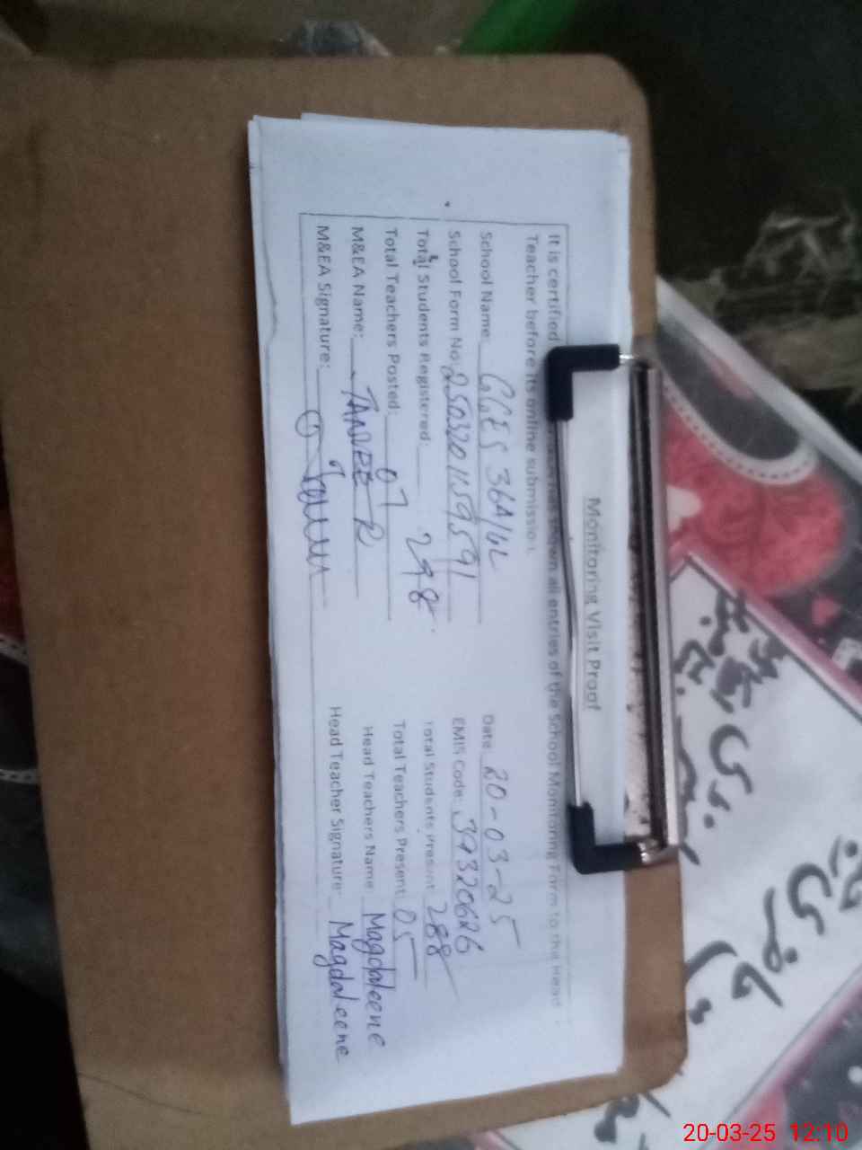 | Attendance Register | Head Teacher | MEA with School | Visit Proof |