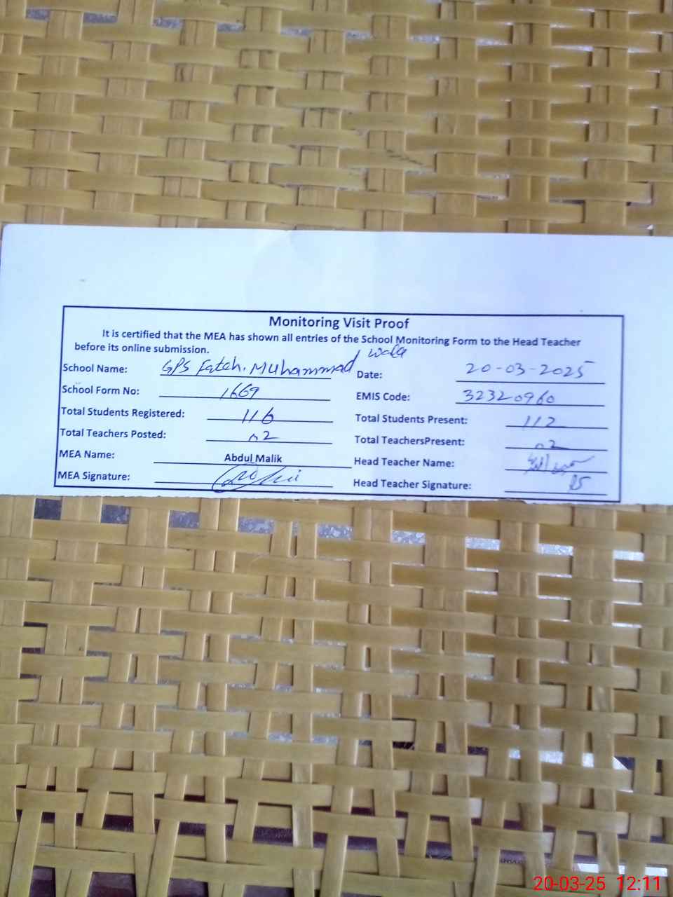 | Attendance Register | Head Teacher | MEA with School | Visit Proof |
