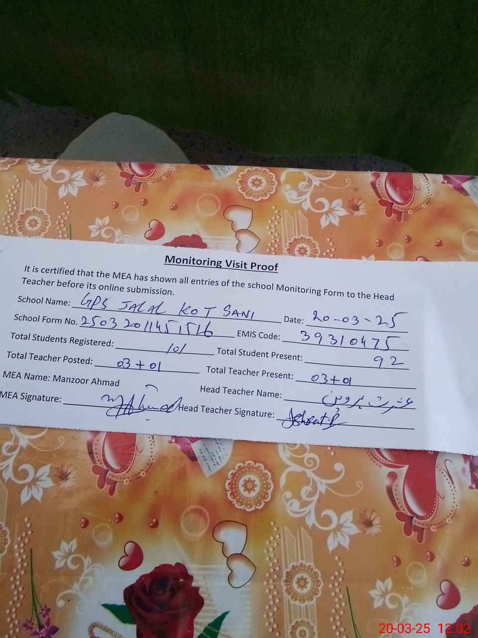 | Attendance Register | Head Teacher | MEA with School | Visit Proof |