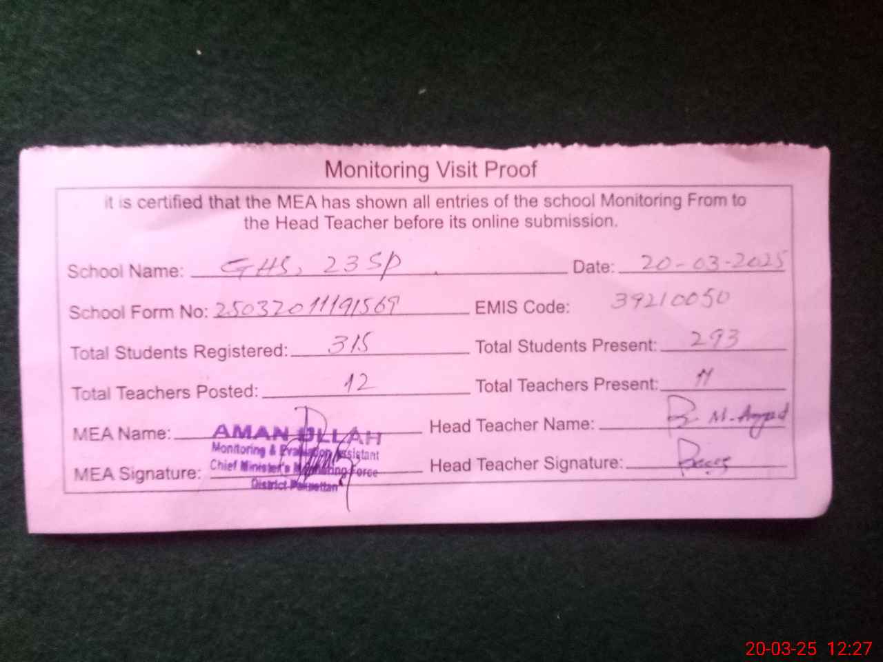 | EMIS Code: 39210050 | Name of School: GHS 23/S.P | |||