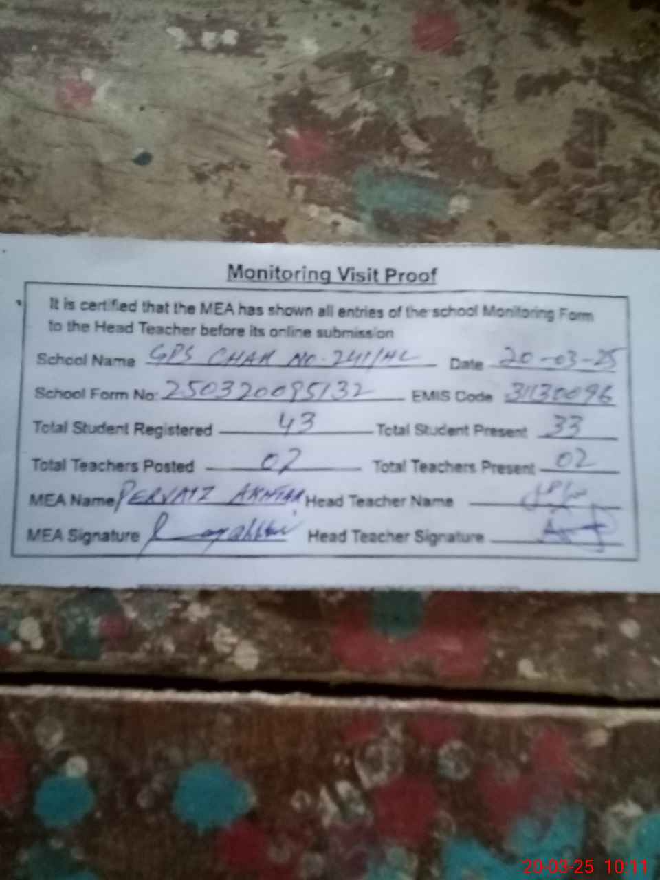 | Attendance Register | Head Teacher | MEA with School | Visit Proof |