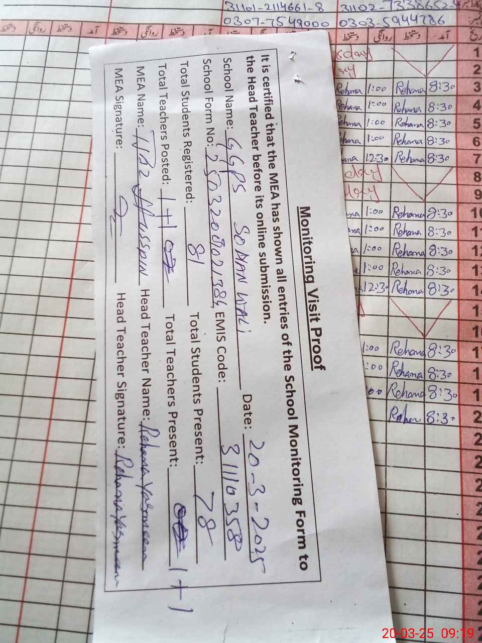 | Attendance Register | Head Teacher | MEA with School | Visit Proof |