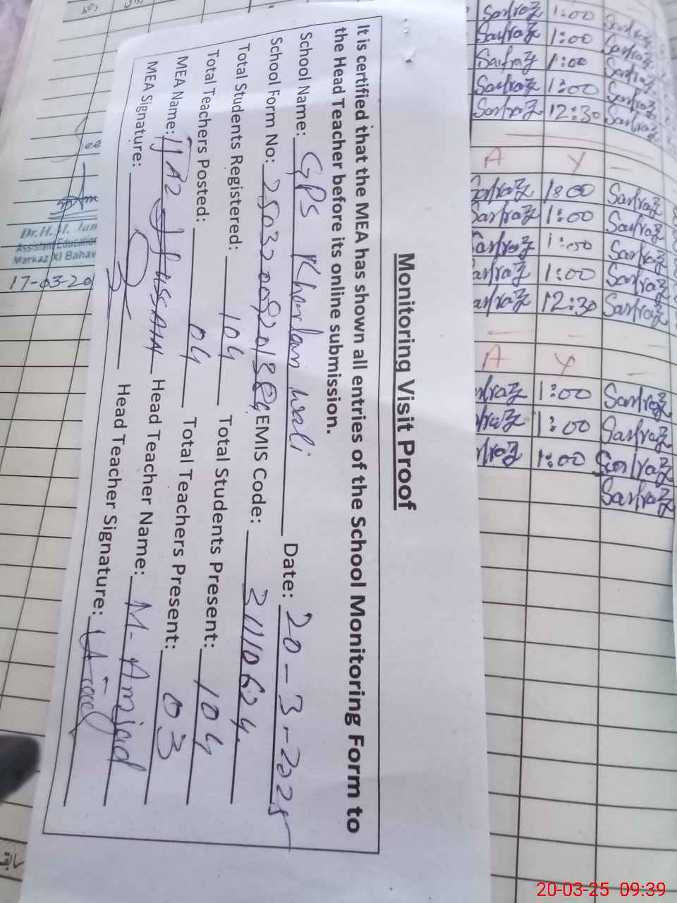 | EMIS Code: 31110624 | Name of School: GPS KHARLAN WALI | |||
