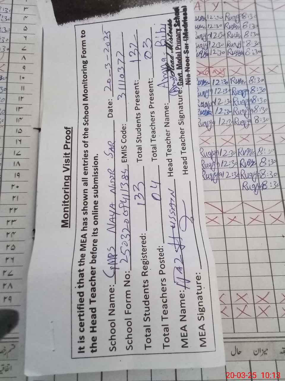 | Attendance Register | Head Teacher | MEA with School | Visit Proof |