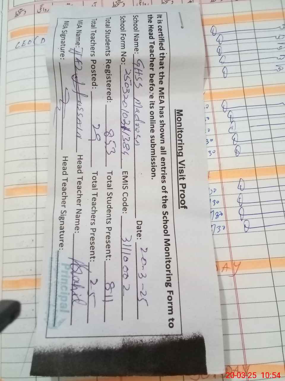 | Attendance Register | Head Teacher | MEA with School | Visit Proof |