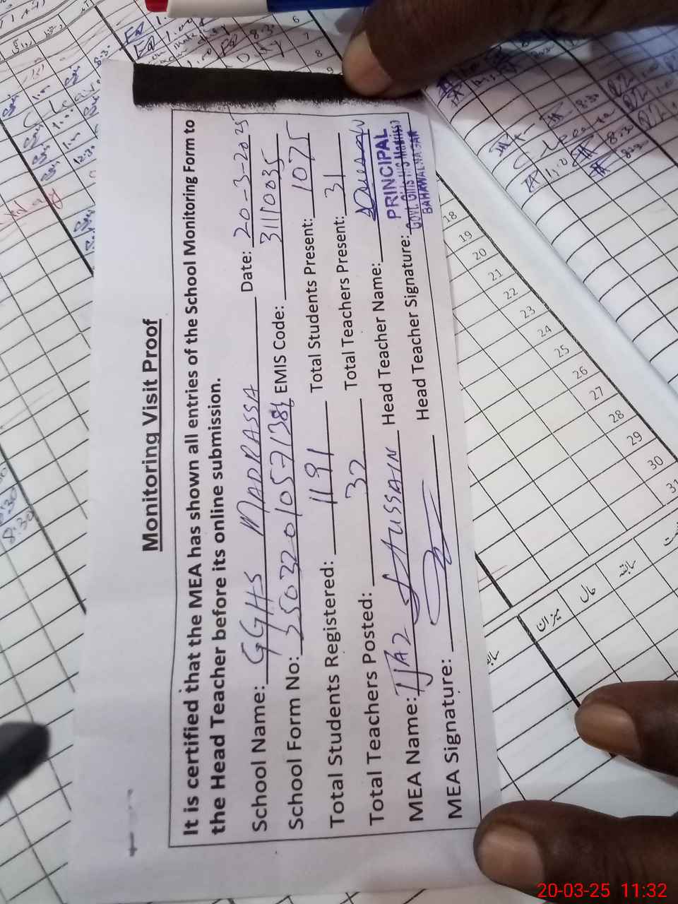 | Attendance Register | Head Teacher | MEA with School | Visit Proof |