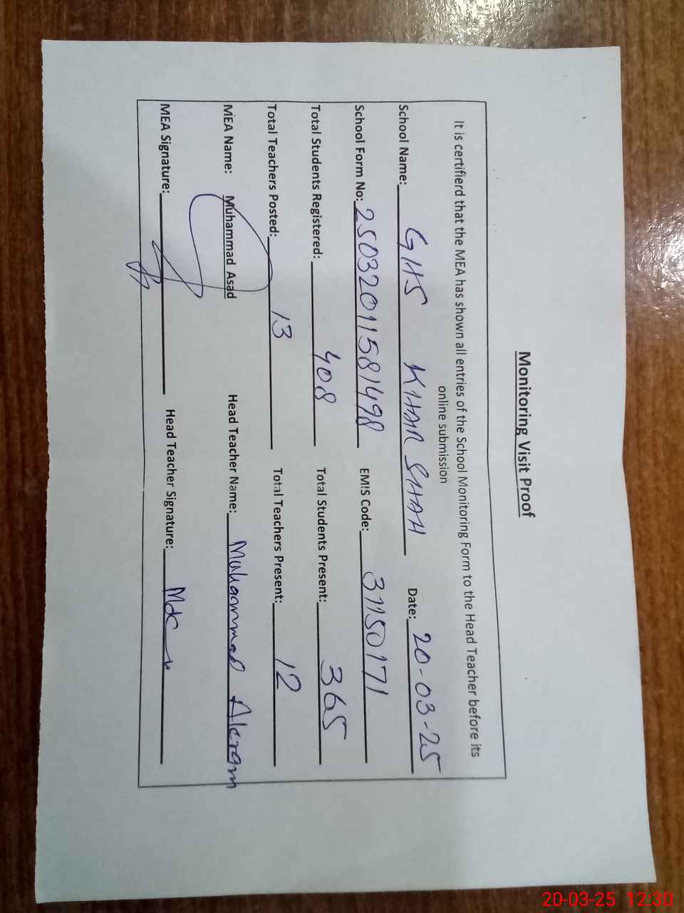 | Attendance Register | Head Teacher | MEA with School | Visit Proof |
