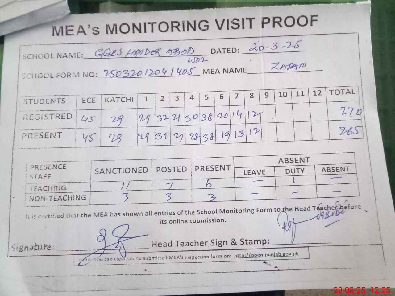 | Attendance Register | Head Teacher | MEA with School | Visit Proof |