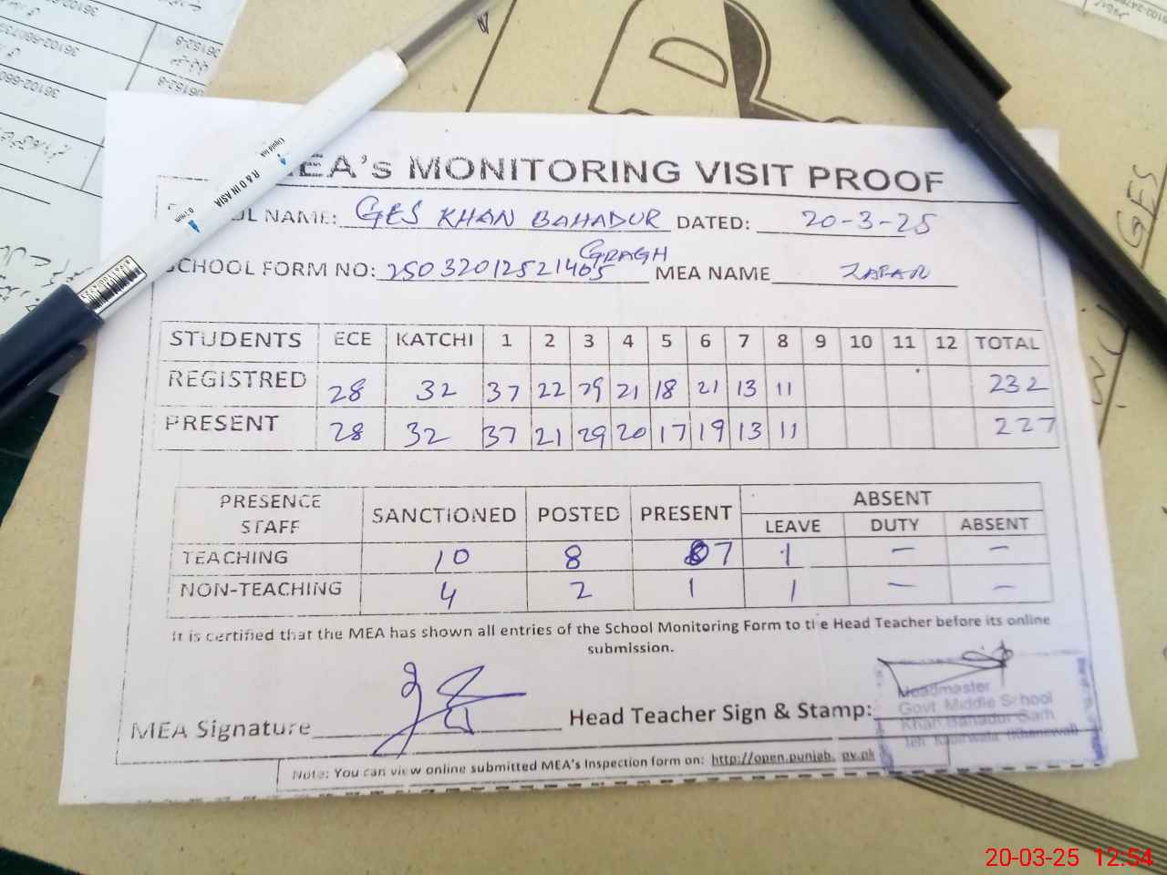 | Attendance Register | Head Teacher | MEA with School | Visit Proof |