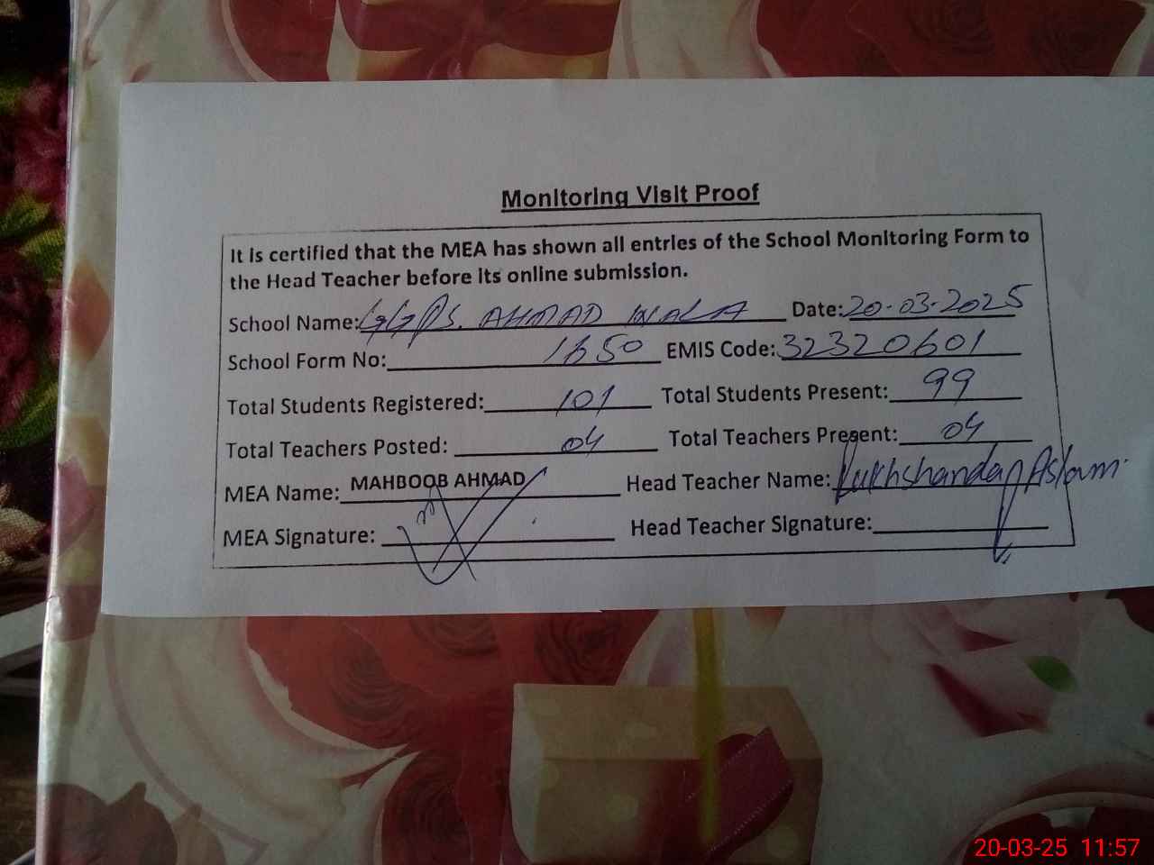 | EMIS Code: 32320601 | Name of School: GGPS AHMAD WALA | |||
