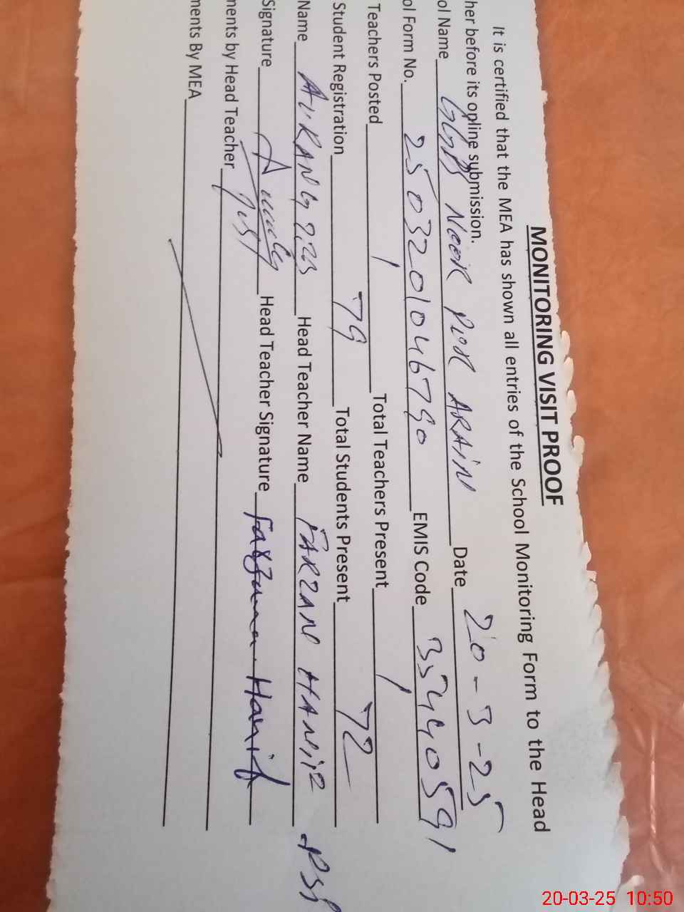 | Attendance Register | Head Teacher | MEA with School | Visit Proof |