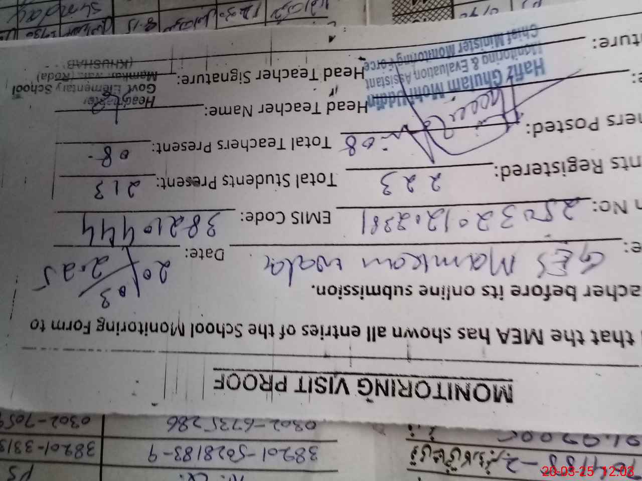 | Attendance Register | Head Teacher | MEA with School | Visit Proof |