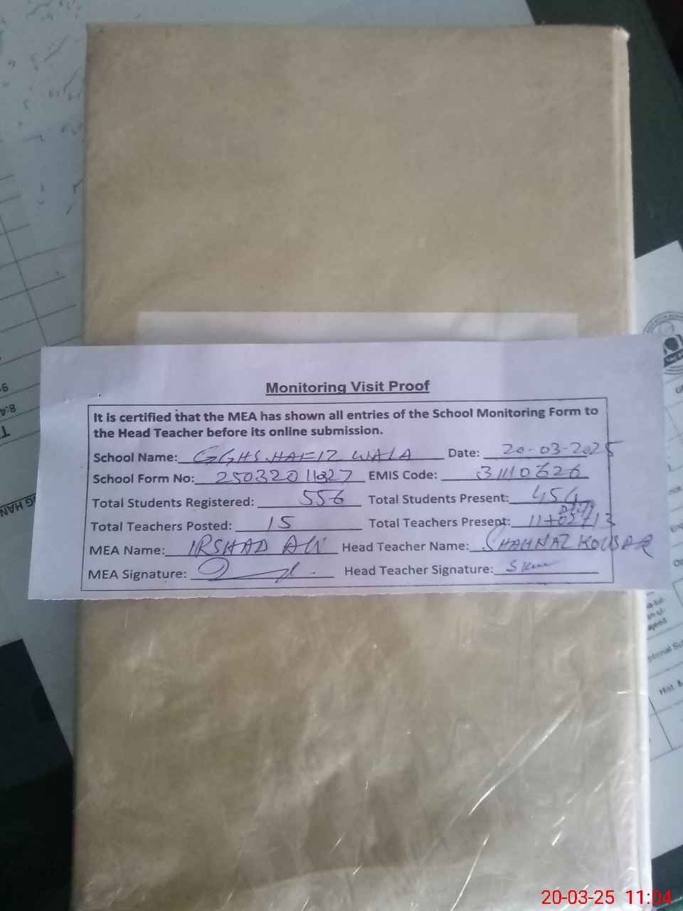 | EMIS Code: 31110626 | Name of School: GGHS HAFIZ WALA | |||
