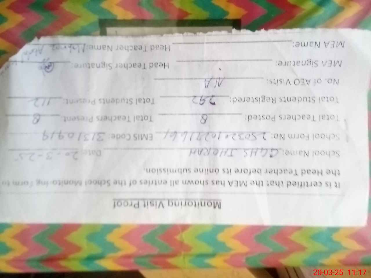 | Attendance Register | Head Teacher | MEA with School | Visit Proof |