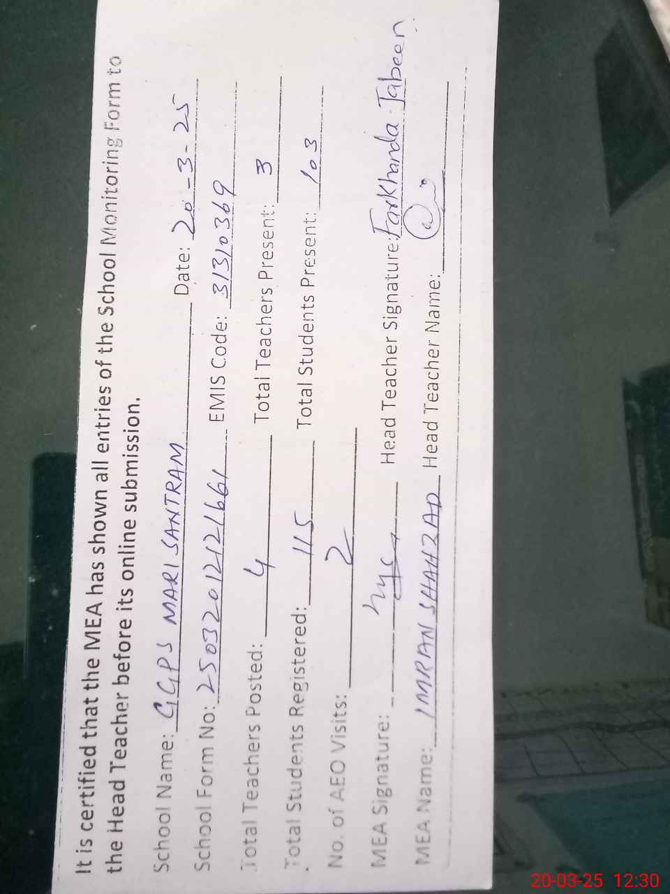 | Attendance Register | Head Teacher | MEA with School | Visit Proof |