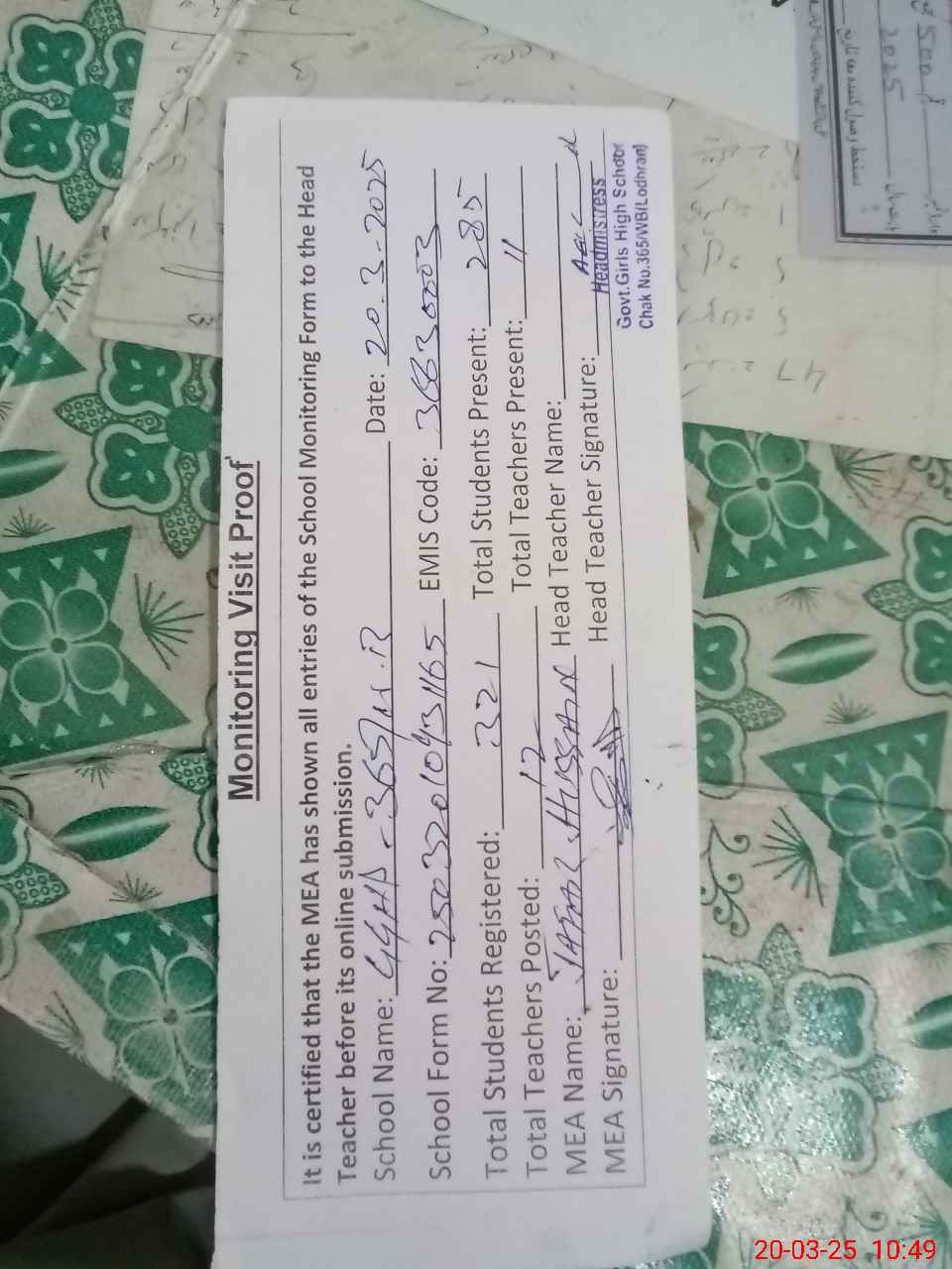 | Certified that this School was Inspected by the Undersigned MEA/DMO Today and the Information Stated Above is as Per Record. | |||||