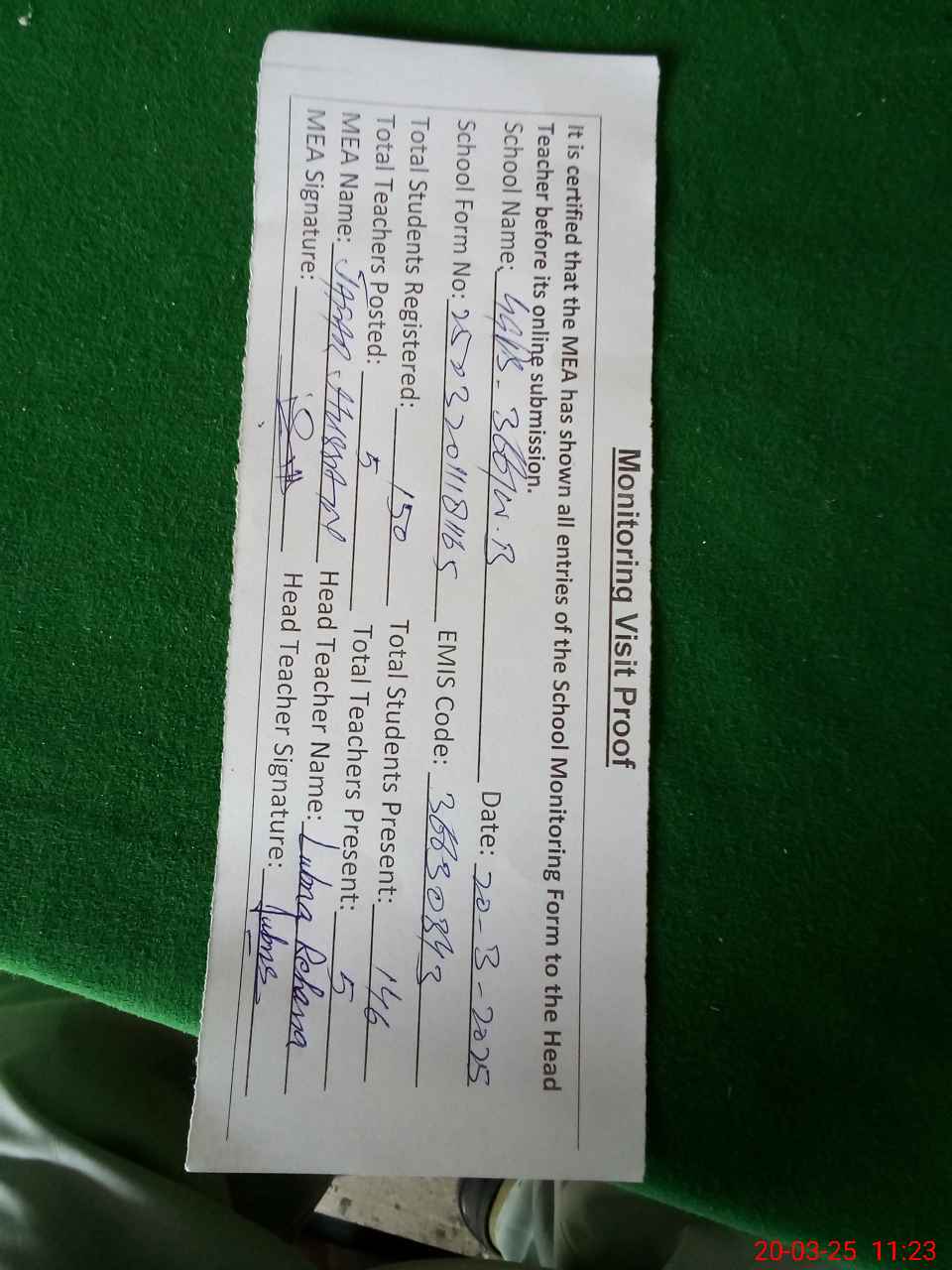 | Attendance Register | Head Teacher | MEA with School | Visit Proof |