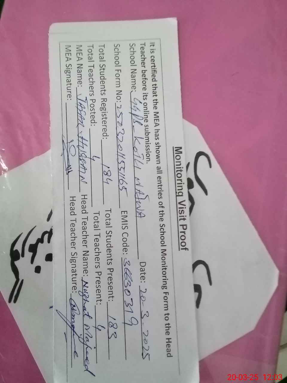 | Name: NU**** MA**** Designation: (School Headmaster's/Headmistress's) PTC/JV Phone/Cell Number: 03**** |
