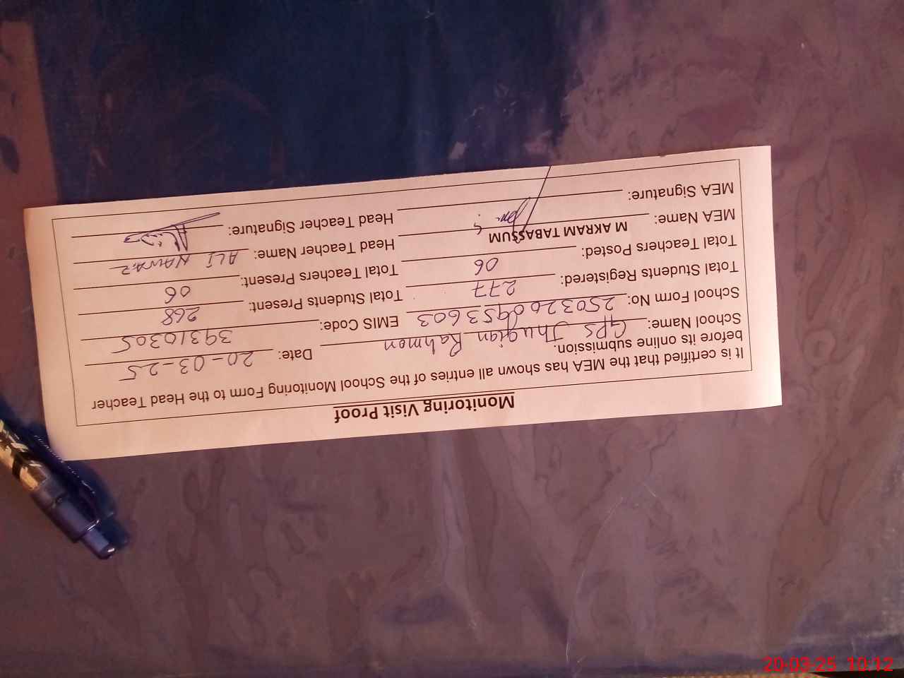 | Attendance Register | Head Teacher | MEA with School | Visit Proof |