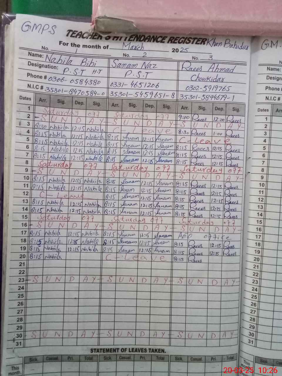 | CNIC | Full Name | Designation | R/C | Absence During Last Calender Month |