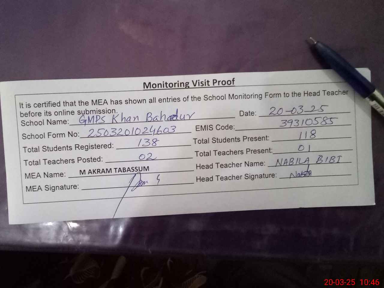 | Attendance Register | Head Teacher | MEA with School | Visit Proof |