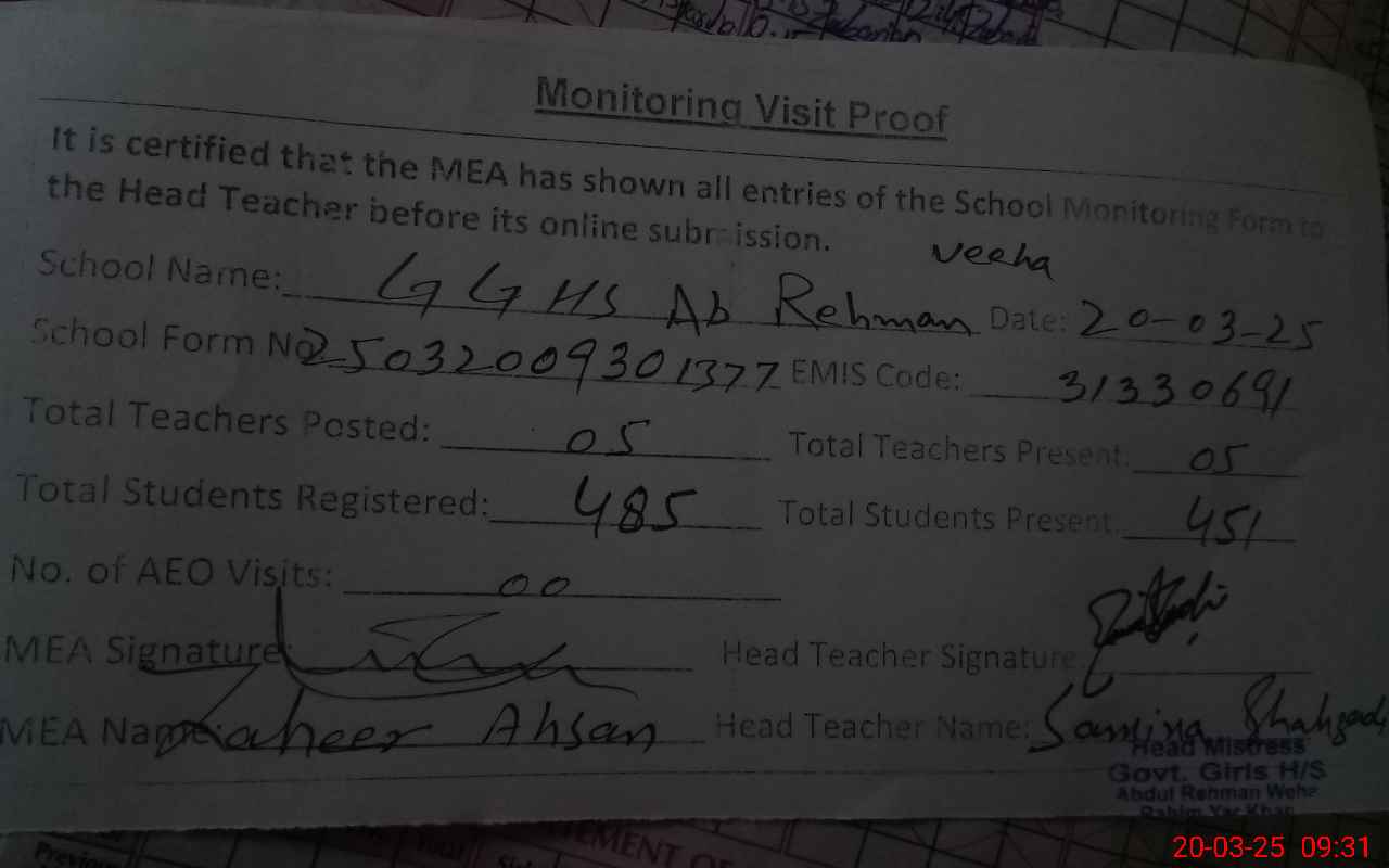 | Attendance Register | Head Teacher | MEA with School | Visit Proof |