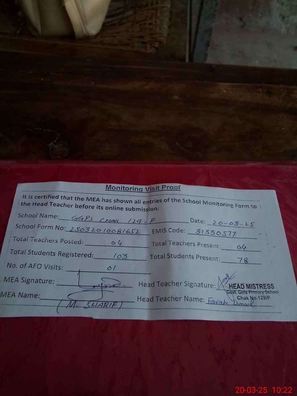 | Attendance Register | Head Teacher | MEA with School | Visit Proof |
