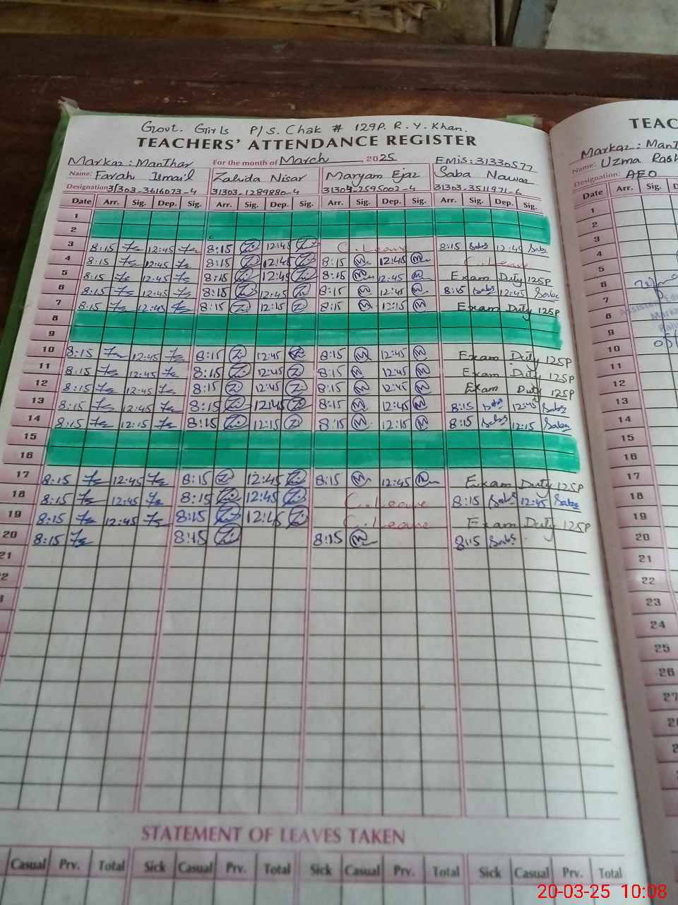 | Leave | Duty | Absent | Maternity | Medical | Ex- Pak |