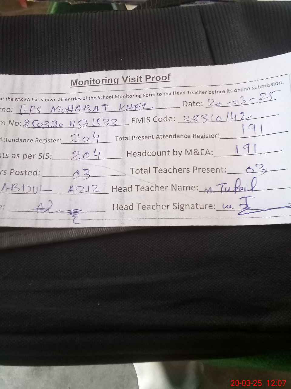 | EMIS Code: 38310142 | Name of School: GPS MOHABAT KHEL | |||