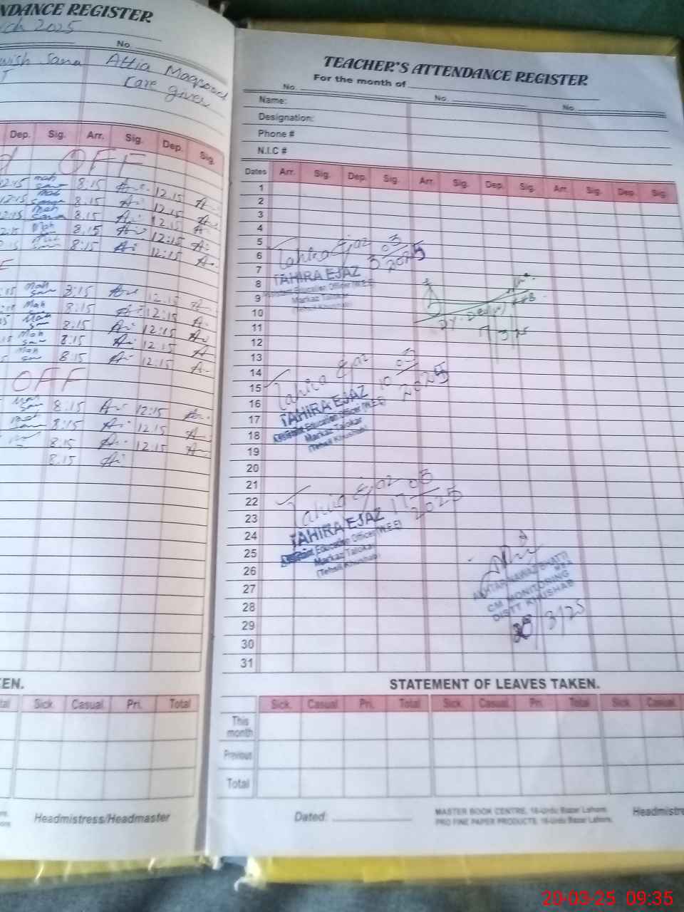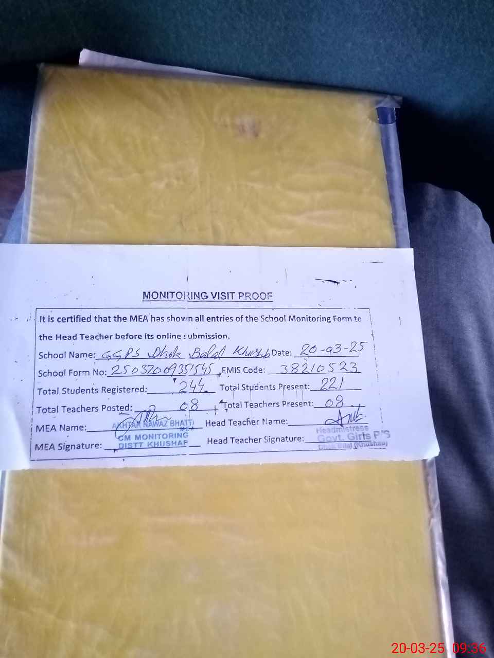| Attendance Register | Head Teacher | MEA with School | Visit Proof |