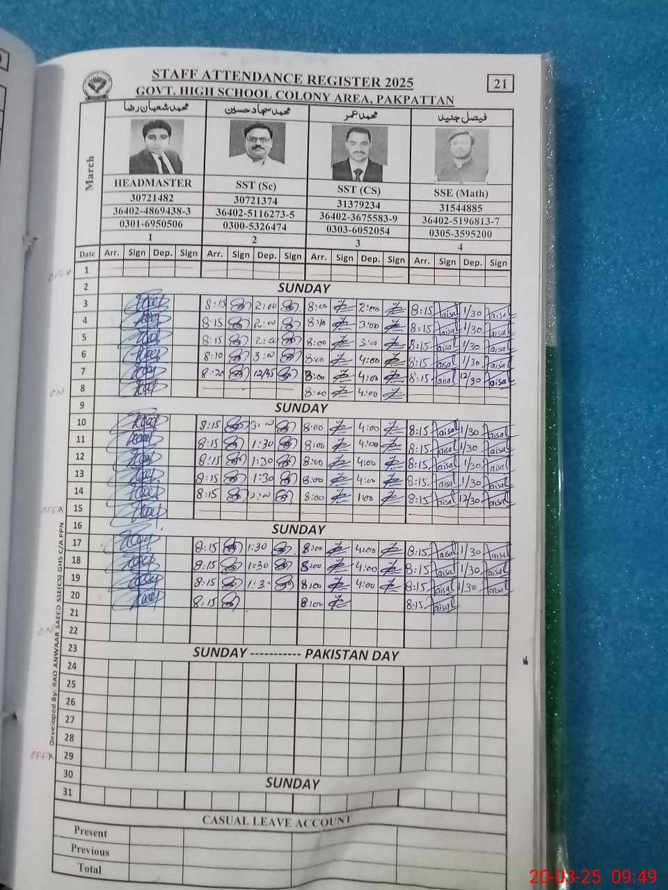 | Name: SA**** HU**** Designation: (School Headmaster's/Headmistress's) HEADMASTER Phone/Cell Number: 03**** |