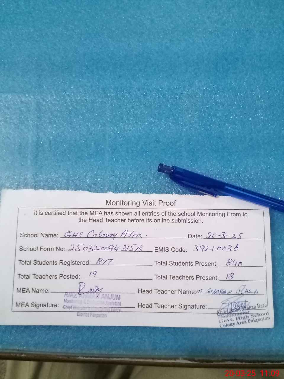 | Attendance Register | Head Teacher | MEA with School | Visit Proof |