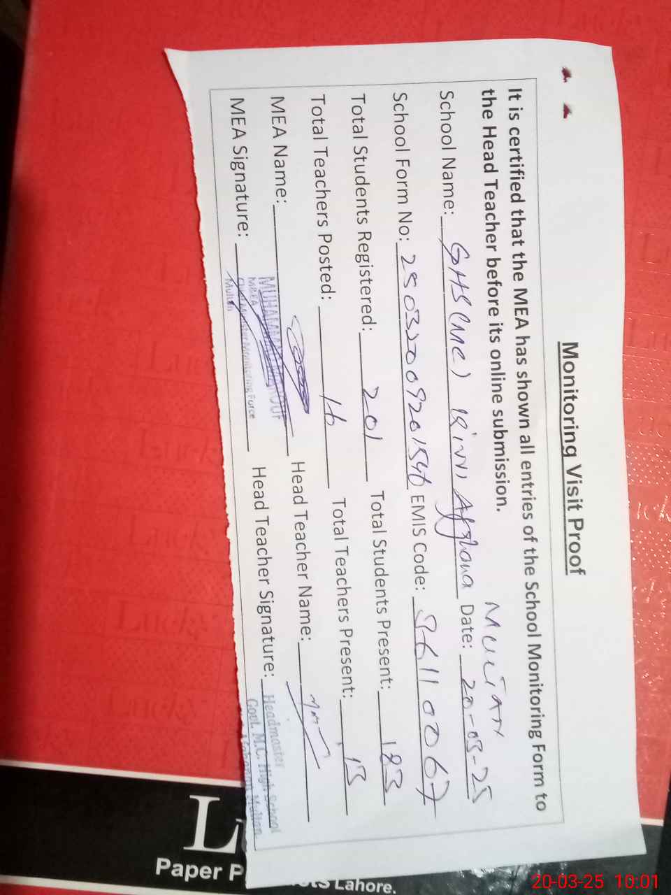 | Attendance Register | Head Teacher | MEA with School | Visit Proof |