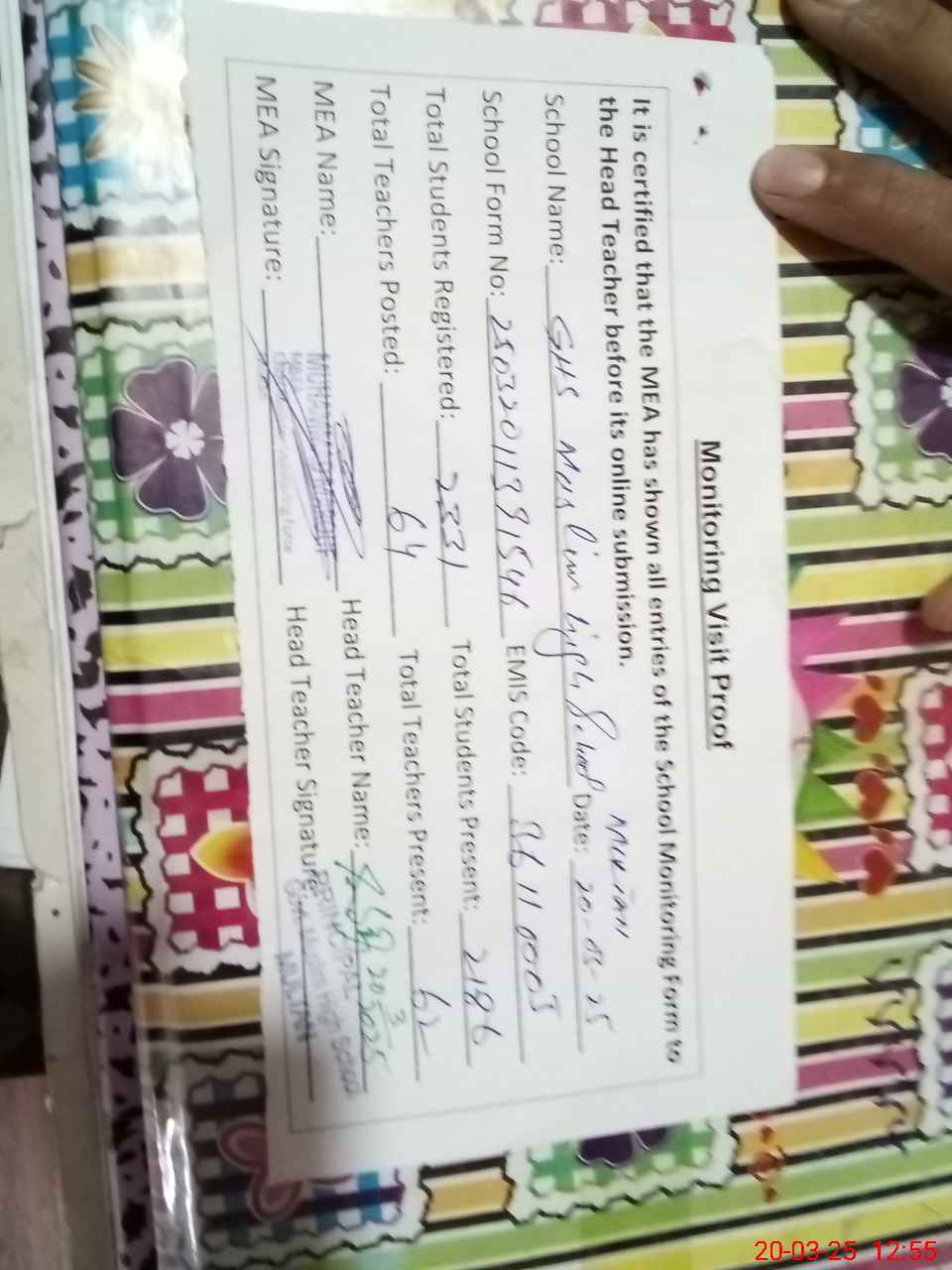 | Attendance Register | Head Teacher | MEA with School | Visit Proof |