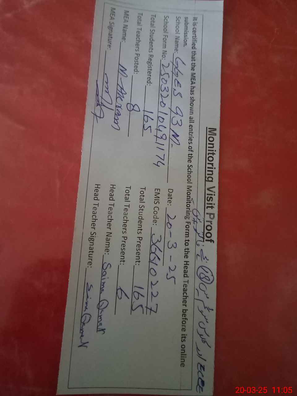 | Attendance Register | Head Teacher | MEA with School | Visit Proof |