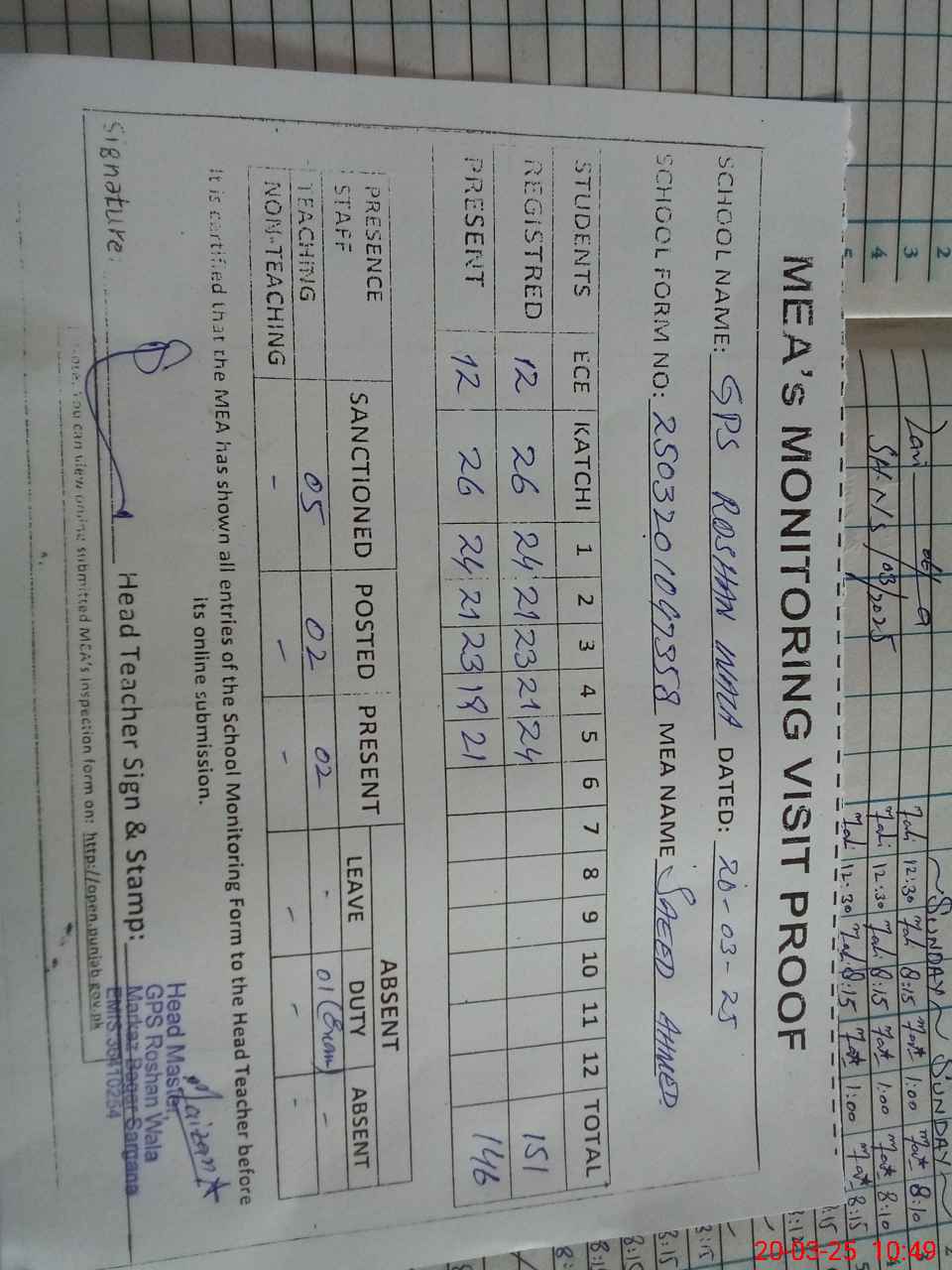 | Attendance Register | Head Teacher | MEA with School | Visit Proof |