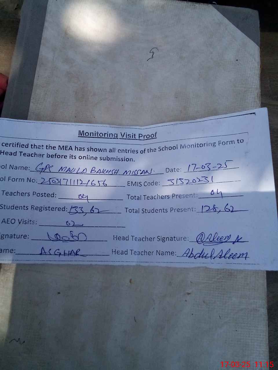 | EMIS Code: 31320231 | Name of School: GPS MOULA BUX MISSAN | |||