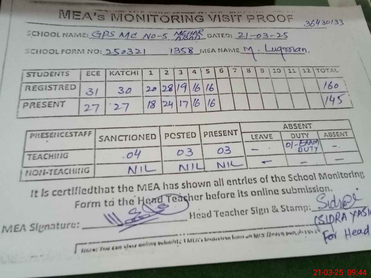 | Attendance Register | Head Teacher | MEA with School | Visit Proof |