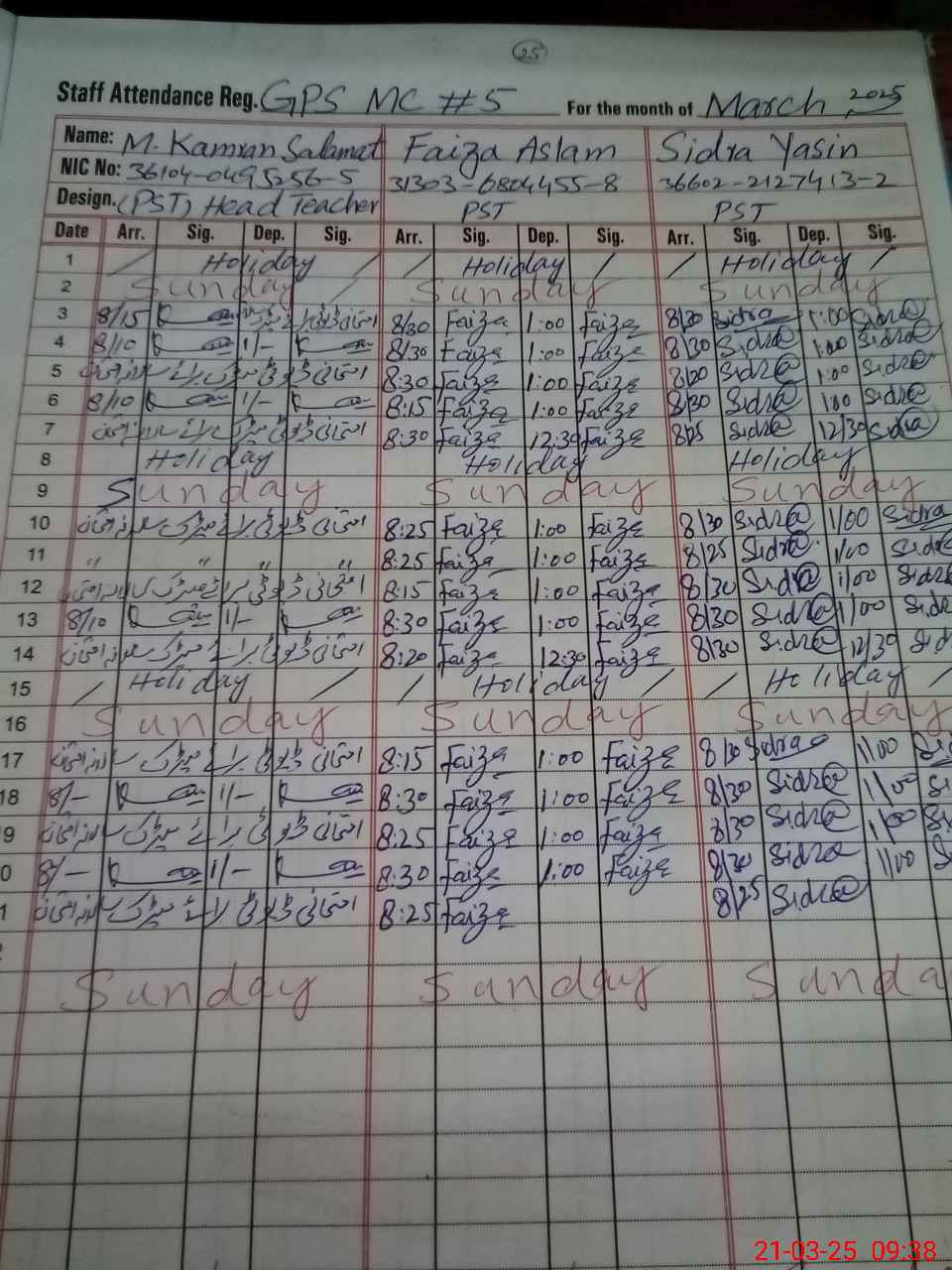 | CNIC | Full Name | Designation | R/C | Absence During Last Calender Month |